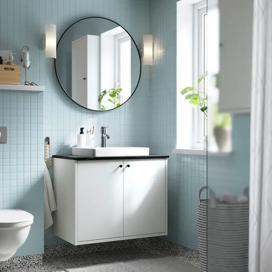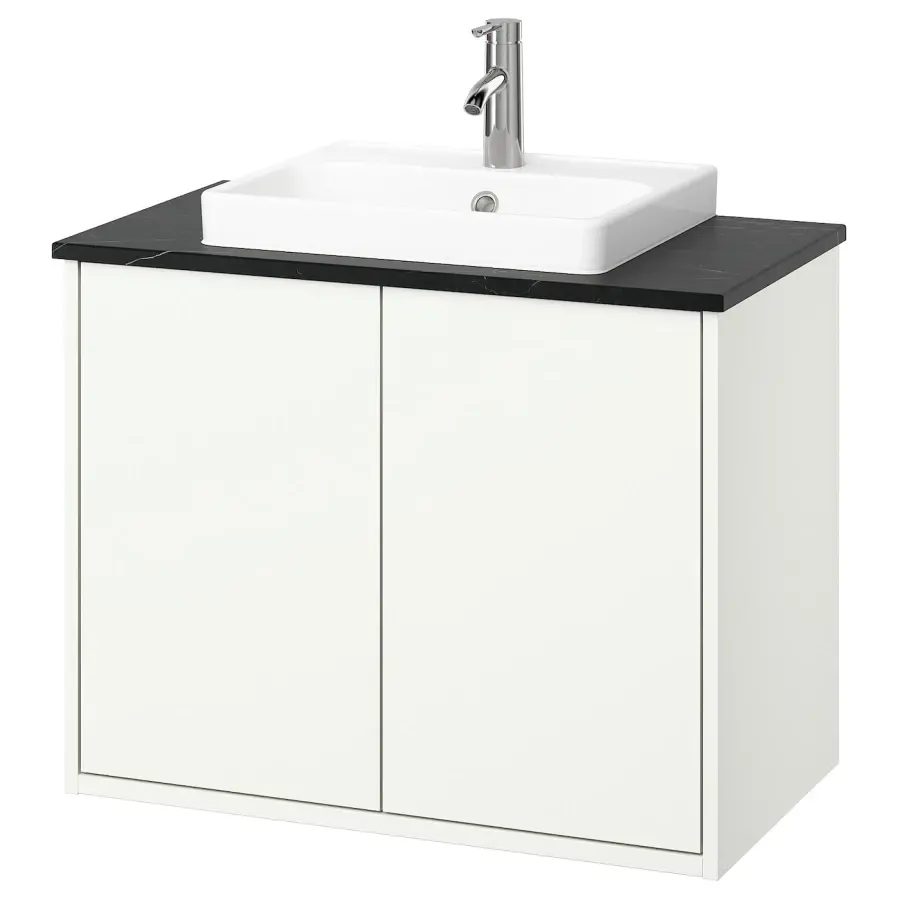 ИКЕА IKEA Мебель для ванной комнаты HAVBÄCK отличается простым, непритязательным дизайном. Шкаф с дверцами, совмещенными со столешницей и частично утопленным в столешницу умывальником, может стать уникальным элементом дизайна, если добавить к нему ручки или ручки. Оригинальная икея/ikea