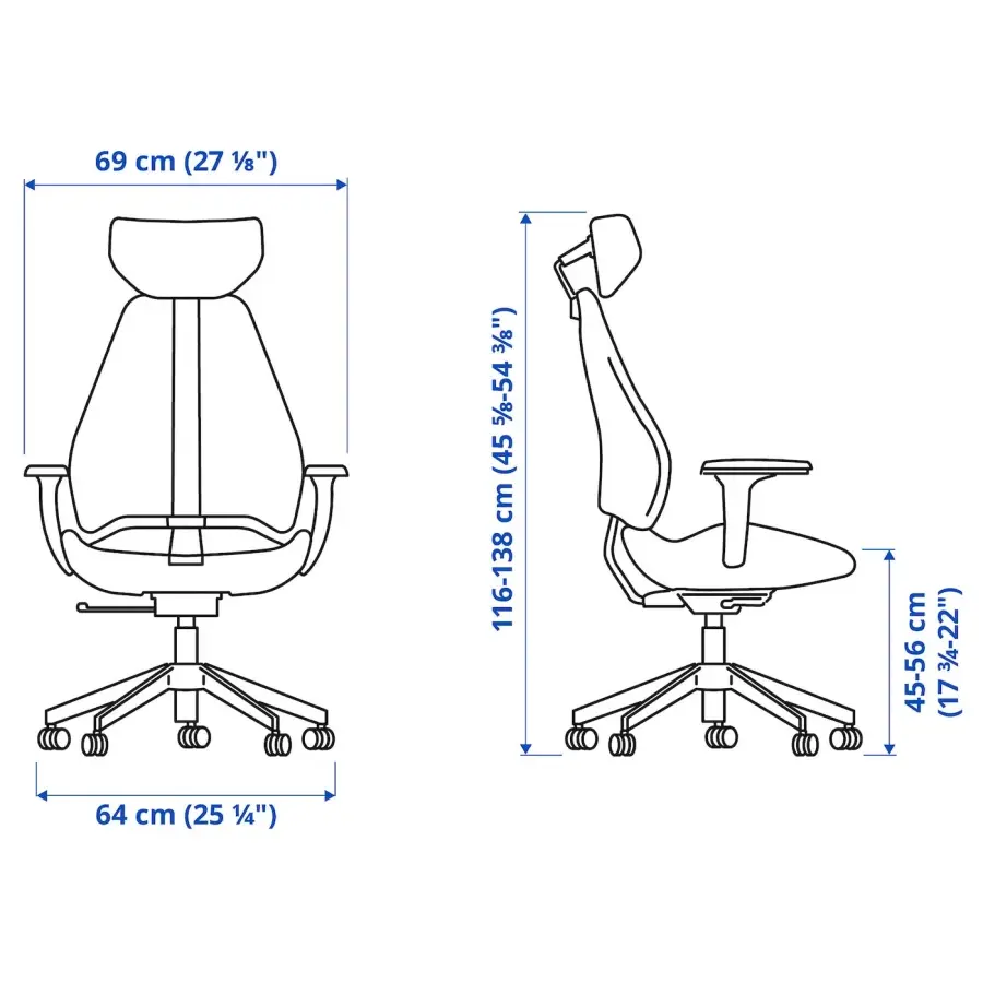 ИКЕА IKEA 3 года гарантии. Прочтите об условиях в гарантийной брошюре. Кресло обеспечивает удобную поддержку спины, помогающую вам сидеть эргономично, так как спинка регулируется по 5 различным высотам и имеет встроенную поясничную опору. Регулируемая и фиксируемая функция наклона повышает устойчивость и контроль в различных положениях сидя. Высококачественная плотная пена обеспечит комфорт в кресле на долгие годы. чтобы расслабиться, вы можете опереться головой о любую сторону подголовника. Высота и горизонтальный угол подлокотников могут регулироваться. Они также следуют за движениями ваших рук во время игры, двигаясь вперед и назад, что снимает нагрузку с рук и плеч. Вы сидите удобно, так как кресло регулируется по высоте. На безопасных роликах есть тормозной механизм, чувствительный к давлению, который удерживает кресло на месте, когда вы встаете, и автоматически освобождается, когда вы садитесь. Колесики с резиновым покрытием обеспечивают плавный ход на любом типе пола. Оригинальная икея/ikea