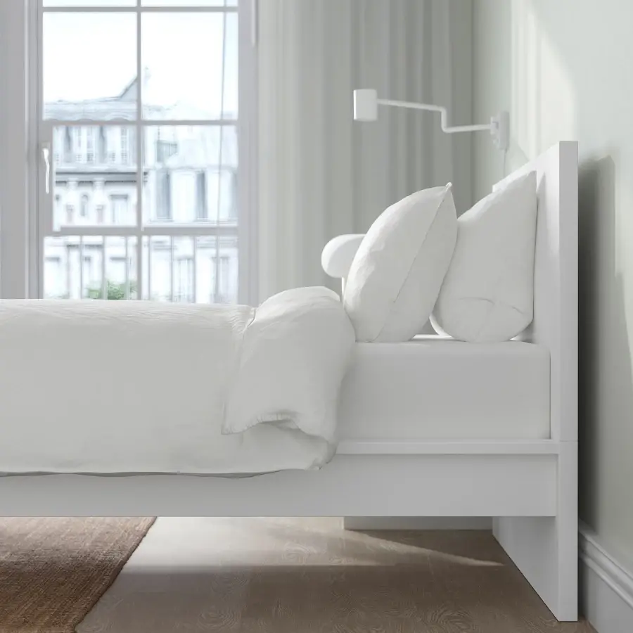 ИКЕА IKEA Этот универсальный каркас кровати будет отлично смотреться с выбранным вами текстилем и мебелью для спальни. Благодаря высокому изголовью вы можете удобно сидеть в постели — просто подложите несколько подушек за спину, и у вас будет удобное место для чтения или просмотра телевизора. Вы можете легко пропылесосить под каркасом кровати, чтобы содержать пространство в чистоте и без пыли. Регулируемые боковины кровати позволяют использовать матрасы разной толщины. Оригинальная икея/ikea