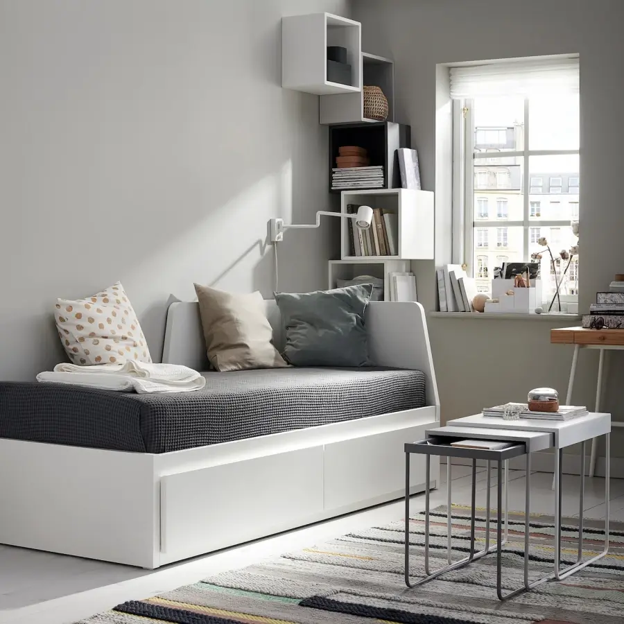 ИКЕА IKEA Спинка крепится с правой или левой стороны кушетки. Мягкие пушистые подушки в качестве опоры для спины легко превращают эту кушетку в удобный диван или шезлонг. Превратите диван в односпальную кровать и максимально используйте пространство на полу. Идеально подходит для спальни подростка или там, где у вас мало места. С этой кушеткой вы быстро и легко создадите место для ночлега гостей. Просто выдвиньте основание кровати, и вы мгновенно получите двуспальную кровать. В больших ящиках есть место для дополнительных одеял, подушек, постельного белья или других вещей, которые вам нужно хранить, но которые вы хотите иметь под рукой. Этот простой дизайн сочетается со многими различными стилями. Оставьте все как есть или создайте уютный уголок с большим количеством подушек. Если набить одеяла и подушки большими наволочками, вы получите и место для хранения, и удобную поддержку спины в течение дня. И умный, и практичный. Оригинальная икея/ikea