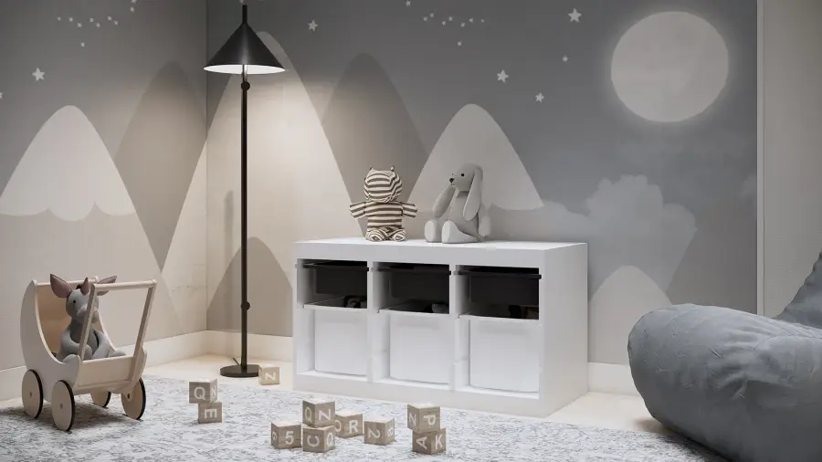 Дизайн для детей: Конструкция стеллажа продумана до мелочей, чтобы дети могли самостоятельно доставать и убирать свои вещи.