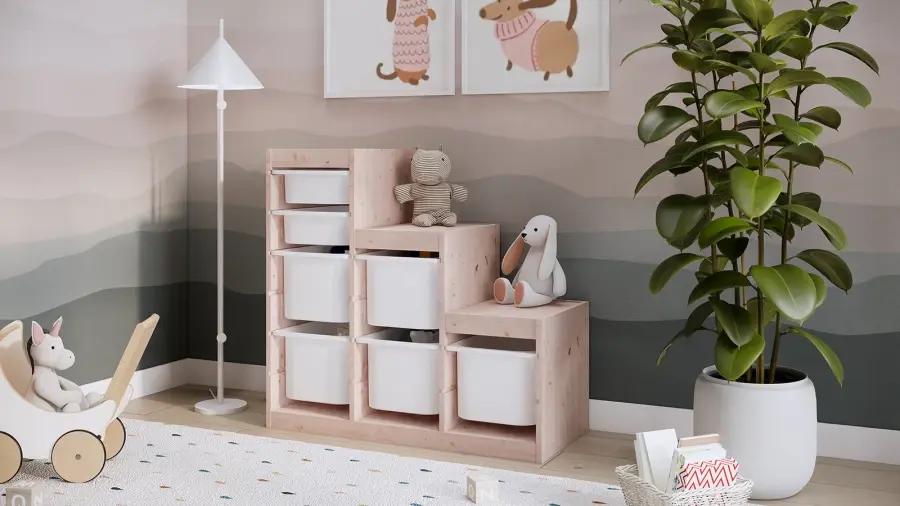 Этот стеллаж станет отличным дополнением к детской комнате, помогая поддерживать порядок и развивать самостоятельность у вашего ребенка.