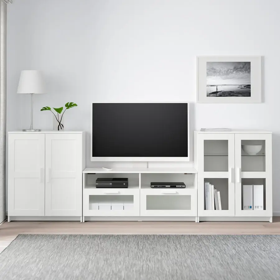 ИКЕА IKEA Эта тумба для телевизора имеет большие ящики, в которых легко хранить пульты дистанционного управления, игровые контроллеры и другие аксессуары для телевизора. Регулируемые полки, так что вы можете настроить пространство для хранения по мере необходимости. Кабельные розетки облегчают вывод кабелей сзади, поэтому они скрыты от глаз, но всегда под рукой, когда они вам нужны. Со стеклянной дверью шкафа вы можете хвастаться, а также защищать свою стеклянную посуду или свою любимую коллекцию. комната. Оригинальная икея/ikea