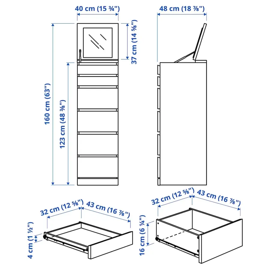 ИКЕА IKEA Конечно, ваш дом должен быть безопасным местом для всей семьи. Вот почему в комплект входит защитное крепление, чтобы вы могли прикрепить комод к стене. Встроенное зеркало. Под зеркалом есть отделение с войлочной подкладкой, которое идеально подходит для хранения ваших часов и украшений. Этот высокий комод дает вам много места для хранения, не занимая слишком много места. Оригинальная икея/ikea