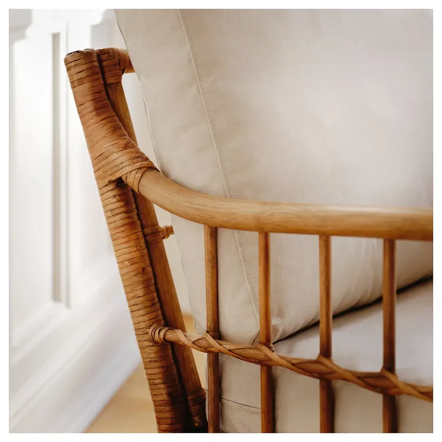ИКЕА IKEA Вы сидите комфортно благодаря мягким подлокотникам и спинке кресла в сочетании с подушками сиденья и спинки. Гибкое плетение из ротанга ручной работы с красивыми деталями делает кресло не только функциональным, но и декоративным. Изготовлено из ротанга, бамбука и дерева акации - натуральных материалов, которые прекрасно стареют и со временем приобретают свой уникальный характер. Оригинальная икея/ikea