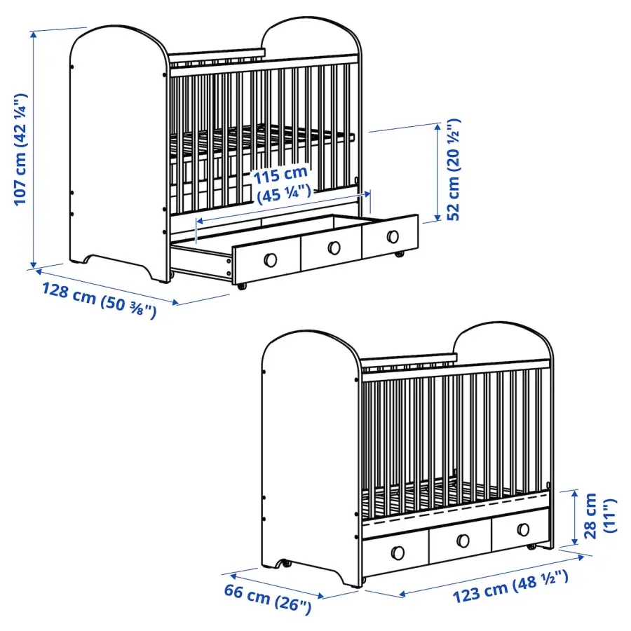 ИКЕА IKEA Основание кроватки можно установить на двух разных высотах. Одну сторону кроватки можно снять, когда ребенок достаточно подрастет, чтобы забраться в кроватку или вылезти из нее. Под кроваткой есть вместительный ящик для хранения, оснащенный направляющими для игрушек или дополнительных постельных принадлежностей, которые легко выкатываются и выдвигаются, а также со встроенным ограничителем ящика, который удерживает ящик на месте. вентиляция для хорошей циркуляции воздуха, которая создает приятный климат для сна вашего ребенка. Оригинальная икея/ikea