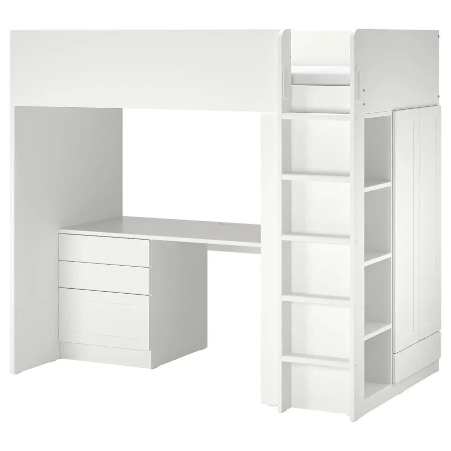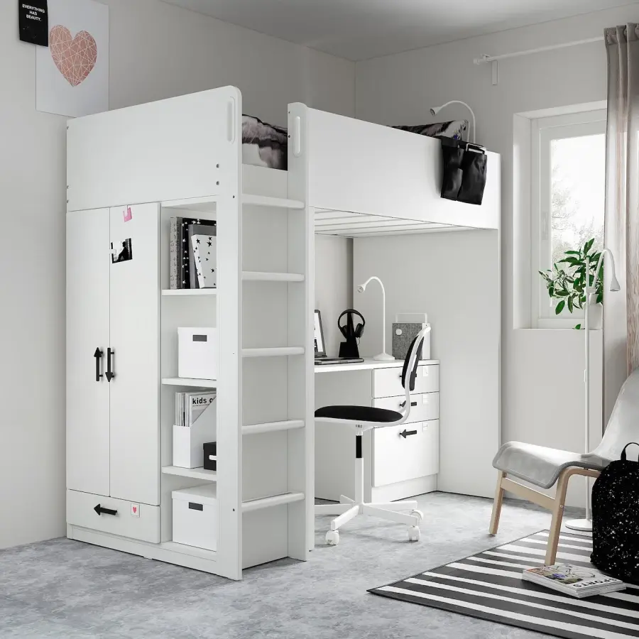ИКЕА IKEA Иметь собственное пространство очень важно в детстве. Эта комбинация является идеальным решением, если вы живете в небольших помещениях или делите комнаты с братьями и сестрами. Компактная комбинация включает в себя кровать-чердак, письменный стол с выдвижными ящиками, платяной шкаф с выдвижным ящиком и книжный шкаф. Лестница крепится справа или слева от кровати. Стол можно установить параллельно или перпендикулярно кровати. Гардероб также можно расположить в разных направлениях. Оригинальная икея/ikea