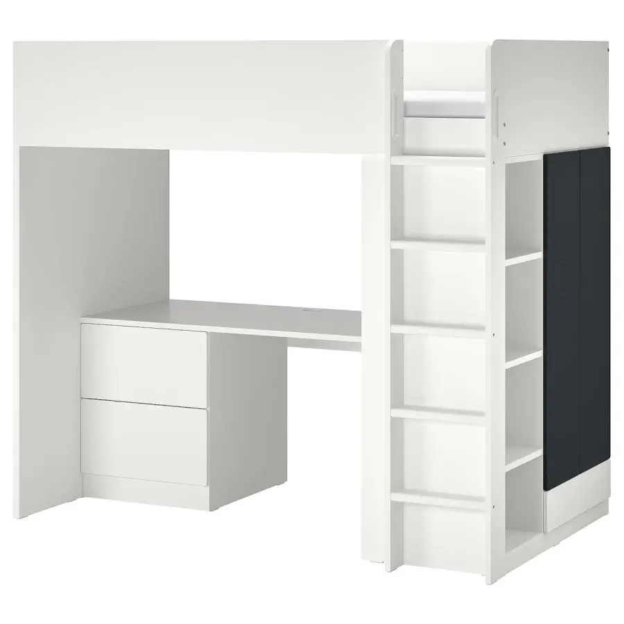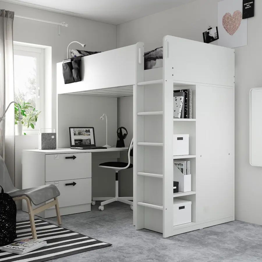 ИКЕА IKEA Иметь собственное пространство очень важно в детстве. Эта комбинация является идеальным решением, если вы живете в небольших помещениях или делите комнату с братьями и сестрами. Компактная комбинация включает в себя кровать-чердак, письменный стол с выдвижными ящиками, платяной шкаф с выдвижным ящиком и книжный шкаф. Лестница крепится справа или слева от кровати. Стол можно установить параллельно или перпендикулярно кровати. Гардероб также можно расположить в разных направлениях. Оригинальная икея/ikea