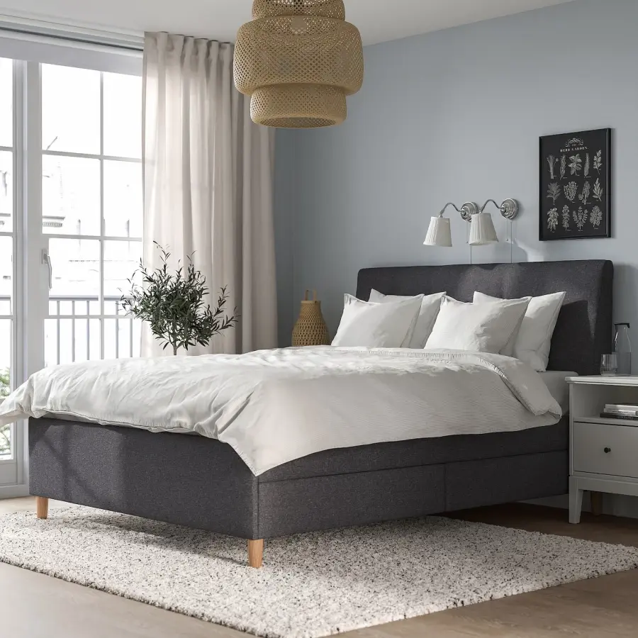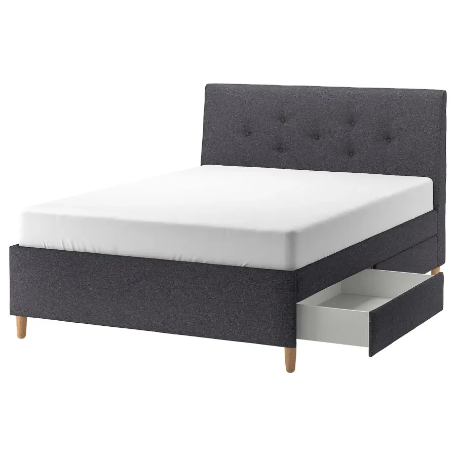 ИКЕА IKEA Наклонное изголовье и мягкая обивка делают каркас кровати чрезвычайно удобным. Классические пуговицы и точёные деревянные ножки вне времени, а ящики с плавным закрыванием под кроватью обеспечивают дополнительное место для хранения вещей. Оригинальная икея/ikea