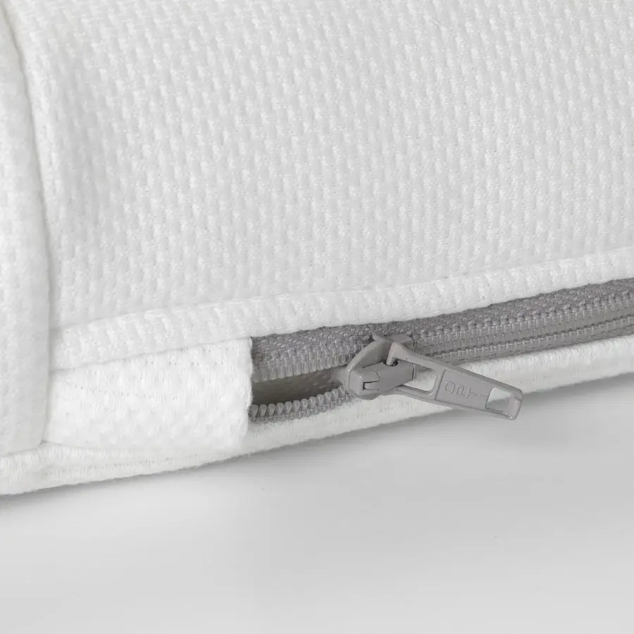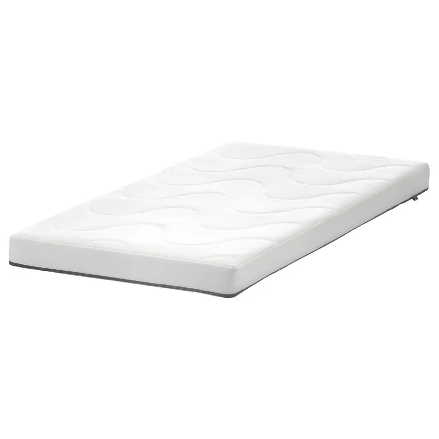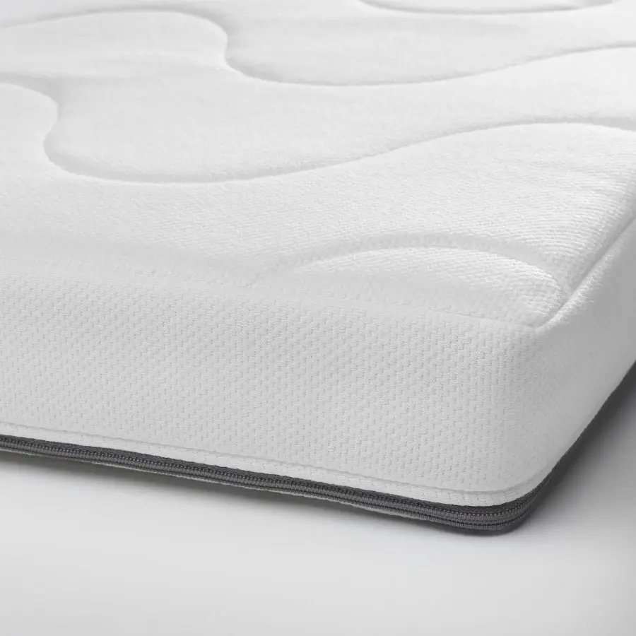 ИКЕА IKEA Внешний чехол легко снимается и стирается в машинке при температуре 60°С. Неподвижный внутренний чехол повышает пожаробезопасность матраса и позволяет легко надевать внешний чехол после стирки. Это также предотвращает попадание содержимого матраса в рот детьми. Молния этого матраса имеет небольшой кармашек, в котором можно спрятать язычок от рук любопытных детей. Матрас имеет две разные поверхности ‒ волнистую сторону средней жесткости и более гладкую сторону. Оригинальная икея/ikea