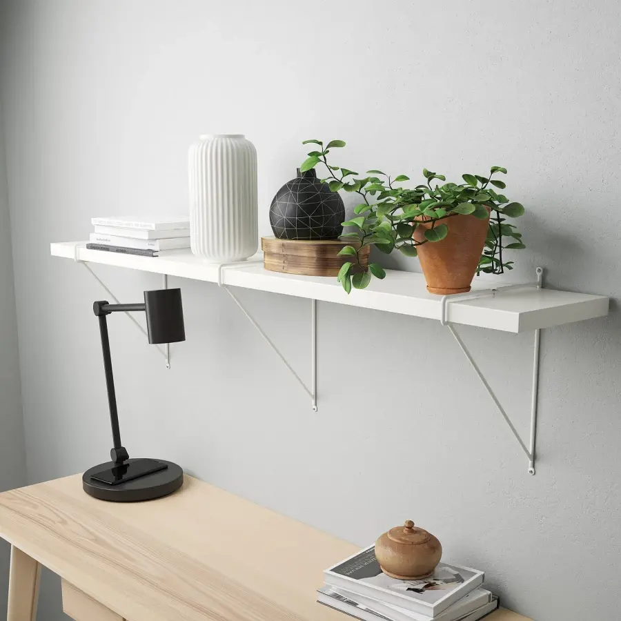 ИКЕА IKEA Настенная полка имеет один скошенный и один гладкий край на длинной стороне, поэтому вы можете выбрать сторону, с которой вы хотите быть обращенной к комнате, в зависимости от того, какой из двух разных стилей вам нравится больше всего. Вы можете установить кронштейны над или под полкой, создавая таким образом два разных выражения. Оригинальная икея/ikea