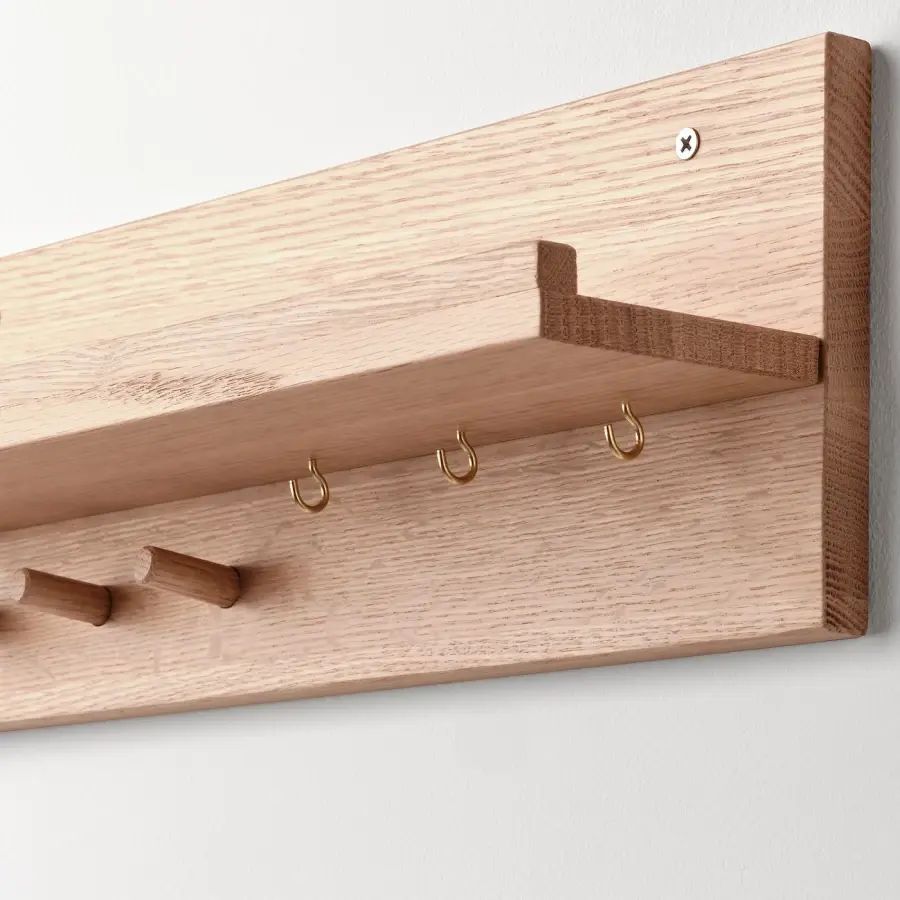 Превращает неиспользуемое пространство в практичное место для хранения мелких вещей, которые вы хотите иметь под рукой. Полка имеет бортик, который предотвращает падение вещей, а под ней имеются металлические и деревянные крючки. С помощью этого настенного органайзера вы можете иметь под рукой все: от мобильного телефона, писем и ключей до больших сумок и поводков для собак, когда вы выбегаете за дверь. Также отлично подходит для кулинарных книг, специй и кухонных полотенец на кухне. Дерево — это натуральный живой материал, а различия в текстуре, цвете и текстуре делают каждое изделие уникальным. Массив дерева придает этому настенному органайзеру подлинное ощущение качества.