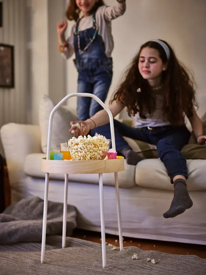 Приставной столик легкий и достаточно маленький, чтобы его можно было поднять одной рукой, а ручка позволяет легко переносить его по дому. Ручка изогнута таким образом, что обеспечивает хороший захват и баланс при переноске вещей на столе. Благодаря высоте ручки достаточно места для таких вещей, как бутылки и вазы. Столешница имеет очень высокие края, поэтому вещи не соскальзывают, когда вы переносите приставной столик. Прозрачная лакированная поверхность легко чистится и устойчива к пятнам. Саморегулирующиеся пластиковые ножки обеспечивают повышенную устойчивость. Легко собрать без инструментов и винтов.
