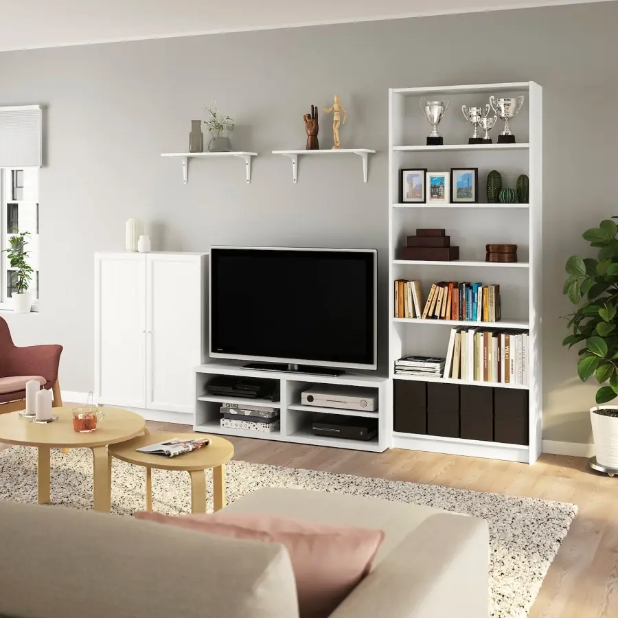 ИКЕА IKEA Кабели от телевизора и других устройств легко держать вне поля зрения, но под рукой, так как в задней части тумбы для телевизора есть несколько выходов для кабелей. За панельными дверцами вы можете спрятать свои вещи и защитить их от пыли. Регулируемые петли позволяют регулировать дверцу по горизонтали и вертикали. Регулируемые полки; адаптируйте пространство между полками в соответствии с вашими потребностями. Оригинальная икея/ikea