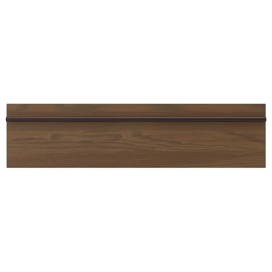 ИКЕА IKEA Кухонные фасады STENSTA из мореного ясеневого шпона темно-коричневого цвета с богатой текстурой сочетаются с широкими ручками из массива дерева, идущими вдоль всего фасада, подчеркивая красивую, линейную планировку всей композиции. Оригинальная икея/ikea