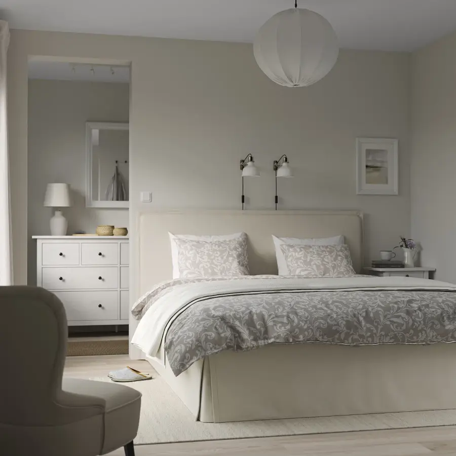 ИКЕА IKEA Каркас кровати с мягким, свободным чехлом, ниспадающей оборкой и тщательно проработанными деталями. Чехол можно снять и постирать в стиральной машине, поэтому постель останется свежей долгие годы. Оригинальная икея/ikea