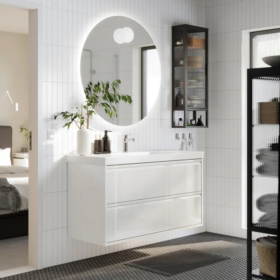 ИКЕА IKEA Современный характер мебели для ванной комнаты серии ЭНГСЁН подчеркнут встроенными ручками и изысканным минимализмом. Шкаф с ящиками спроектирован таким образом, что его можно комбинировать как со столешницей, так и с умывальником. Оригинальная икея/ikea