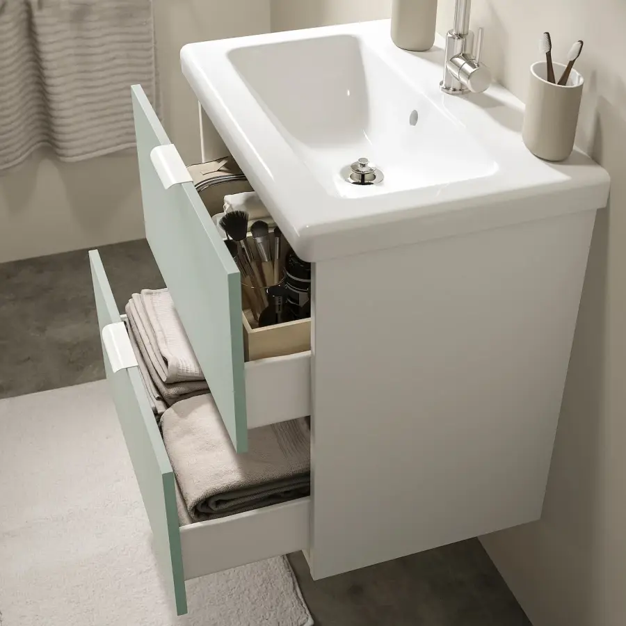 ИКЕА IKEA Серия ENHET позволяет легко представить новое решение для ванной комнаты. Эта тумба под умывальник имеет 2 удобных ящика для необходимых вещей, а светлые серо-зеленые фасады придают ей теплый и живой характер. Оригинальная икея/ikea