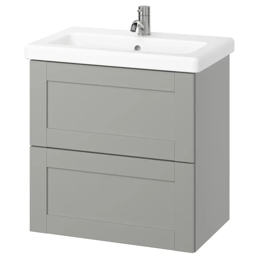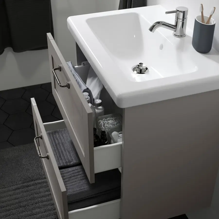 ИКЕА IKEA Серия ENHET упрощает внедрение нового решения в ванной комнате. Тумба под умывальник имеет 2 удобных ящика для необходимых вещей и серые фасады, которые делают ее теплой и уютной. Оригинальная икея/ikea