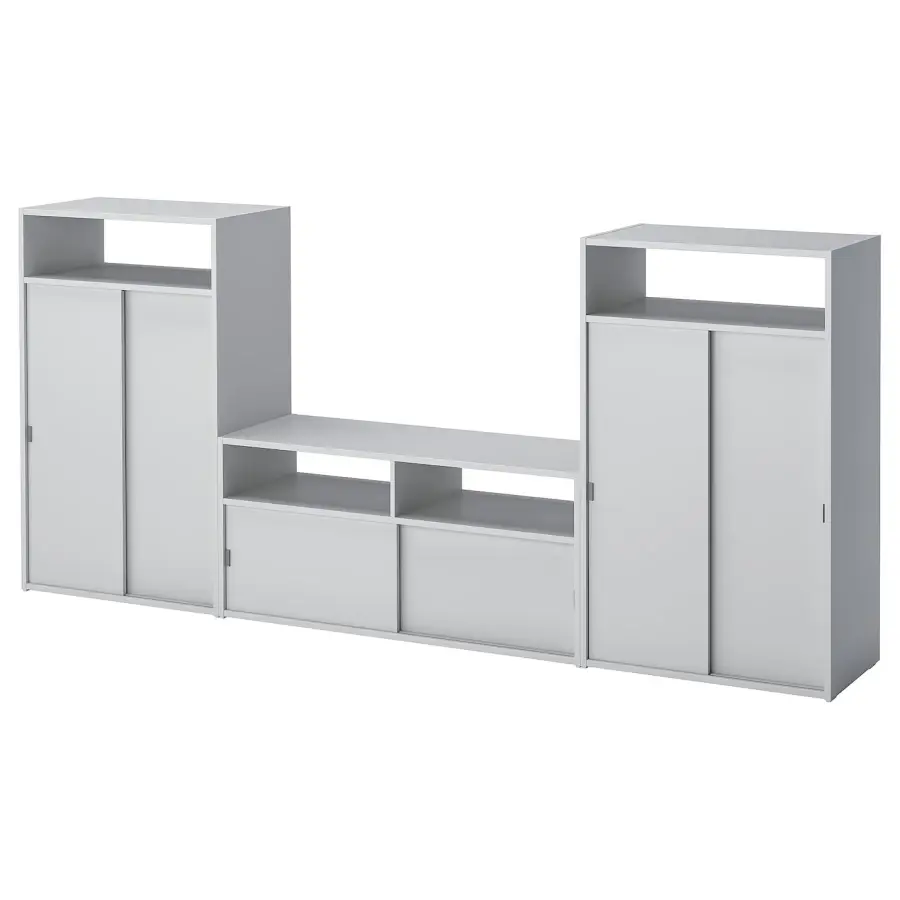 ИКЕА IKEA Комбинация из 2 шкафов СПИКСМЕД и 1 тумбы под ТВ СПИКСМЕД с четкими линиями и как открытым, так и закрытым местом для хранения. Раздвижные двери позволяют разместить место для хранения там, где вам это нужно, и получить большую площадь для размещения мебели, поскольку двери не открываются на любую площадь пола. Открытое хранилище идеально подходит для ваших электронных аксессуаров или любимых предметов, которые вы хотите выставить напоказ. Вы также можете организовать и адаптировать места для хранения в соответствии со своими потребностями, добавив ящики. Вы можете легко спрятать кабели в задней части тумбы под телевизор. Полку внутри можно отрегулировать так, чтобы вы могли адаптировать пространство к тому, что вы хотите хранить. Оригинальная икея/ikea