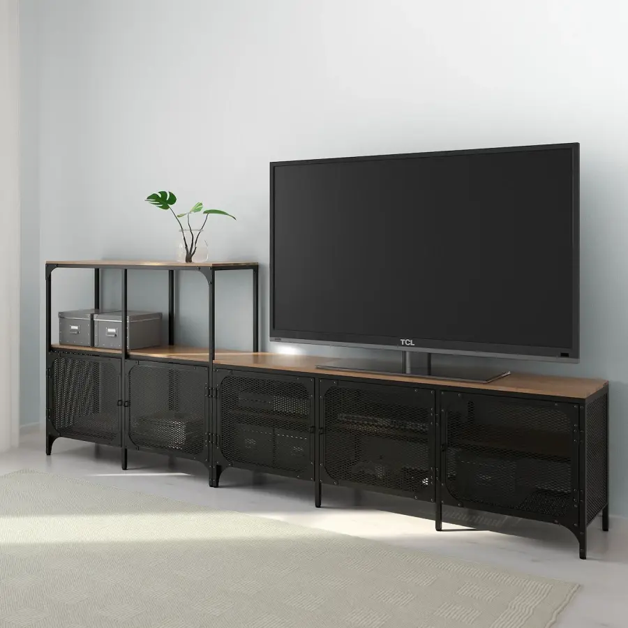ИКЕА IKEA Эта деревенская полка из металла и массива дерева имеет открытую заднюю часть, поэтому на ней легко расположить шнуры и получить доступ к розеткам. Вы можете разместить электронное оборудование за дверцами из металлической сетки, поскольку они пропускают сигналы с вашего пульта дистанционного управления. Блок хранения устойчиво стоит даже на неровных полах, поскольку у него есть регулируемые ножки. Оригинальная икея/ikea
