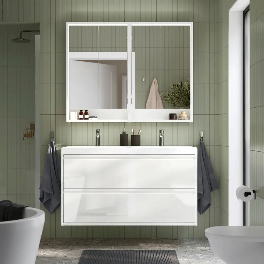 ИКЕА IKEA Мебель для ванной комнаты ÄNGSJÖN восхищает современным дизайном и минималистскими деталями, превращая каждое утро в настоящее удовольствие. В эту комбинацию входят 2 вместительных ящика и двойная раковина, которая легко справится с утренней суетой. Оригинальная икея/ikea