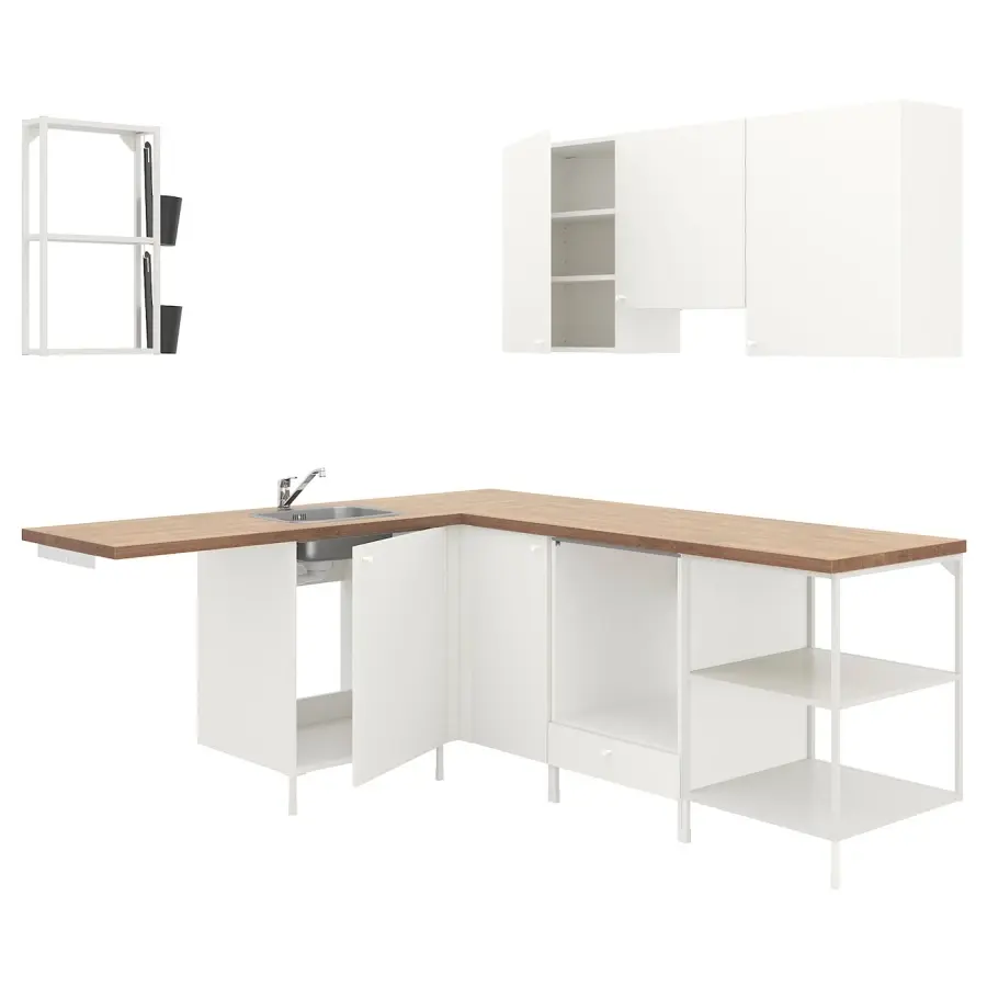 Белые дверцы и фасады ящиков создают чистый, яркий и свежий вид, который можно сочетать с акцентами всех цветов радуги. Легко наслаждаться и всегда стильно. Открытая настенная рама эффективно использует пространство над столешницей. Идеально подходит для подвешивания посуды, размещения посуды или других вещей, которыми вы часто пользуетесь. Навесные шкафы с дверцами эффективно используют пространство над раковиной и столешницей. Идеально подходит для размещения стеклянной и столовой посуды, защищая ее от пыли. Пространство рядом с нижним шкафом для раковины идеально подходит для отдельно стоящего холодильника или стиральной машины, которые продаются отдельно. Угловое решение с 1 базовым шкафом и 1 угловой панелью дает вам достаточно места на рабочей поверхности и места для хранения самых больших кастрюль или редко используемых вещей. Добавьте органайзеры, такие как коробки и держатели для тарелок, чтобы разделить пространство, организовать и эффективно использовать пространство внутри шкафов (продаются отдельно). Открытая базовая рама обеспечивает место для хранения мисок и небольших приборов, таких как тостер, миксер и рисоварка. Возможна установка над настенной вытяжкой. Он будет гармонировать с рядом навесных шкафов ЭНХЕТ (высота 75 см) и создавать единый образ. Эта кухня предназначена для встроенной техники для удобного приготовления пищи. Проем под столешницей идеально подходит для холодильника/морозильника, посудомоечной или стиральной машины. Нижний шкаф для духовки имеет дополнительное место в ящике внизу для сковород, противней или разделочных досок. Пространство рядом с открытой рамой основания идеально подходит для отдельно стоящего холодильника или морозильной камеры, которые продаются отдельно. Как восполнить пробел? Заполните дополнительное пространство на кухне посудомоечной машиной и расслабьтесь после еды, зная, что вы экономите время, энергию и воду. Нет места для стиральной машины? Превратите дополнительное пространство на кухне в функциональное пространство для стирки. Направляющая ENHET для крючков, крючки ENHET и контейнеры SKATTON позволяют использовать каждый сантиметр под открытой рамой ENHET для хранения полотенец, столовых приборов и посуды. Вы можете легко добавить аксессуары ENHET, чтобы расширить возможности использования вашей комбинации для хранения. И самое главное – вам не придется сверлить. Продано отдельно. Уникальные клиновые дюбели облегчают сборку, а фитинги практически незаметны. Ножки ENHET высотой 12,5 см ставят базовые шкафы на удобную высоту и повышают устойчивость. Сделайте образ своим! Поменяйте местами цвет открытых рам и выразительность столешницы и фасадов, чтобы создать современное, классическое, минималистское или красочное решение, которое идеально подойдет вашему стилю. Ручка и ручка GUBBARP из белого пластика имеют простой и современный вид, который легко сочетается с различными дверцами и фасадами ящиков. Эта немного более толстая столешница с закругленным передним краем идеально вписывается в кухню в традиционном стиле. Просто отрежьте нужную длину и закройте края двумя прилагающимися кромочными полосами. Мойка FYNDIG изготовлена из нержавеющей стали — гигиеничного, прочного и долговечного материала, который легко содержать в чистоте. Комплект освещения SKYDRAG р