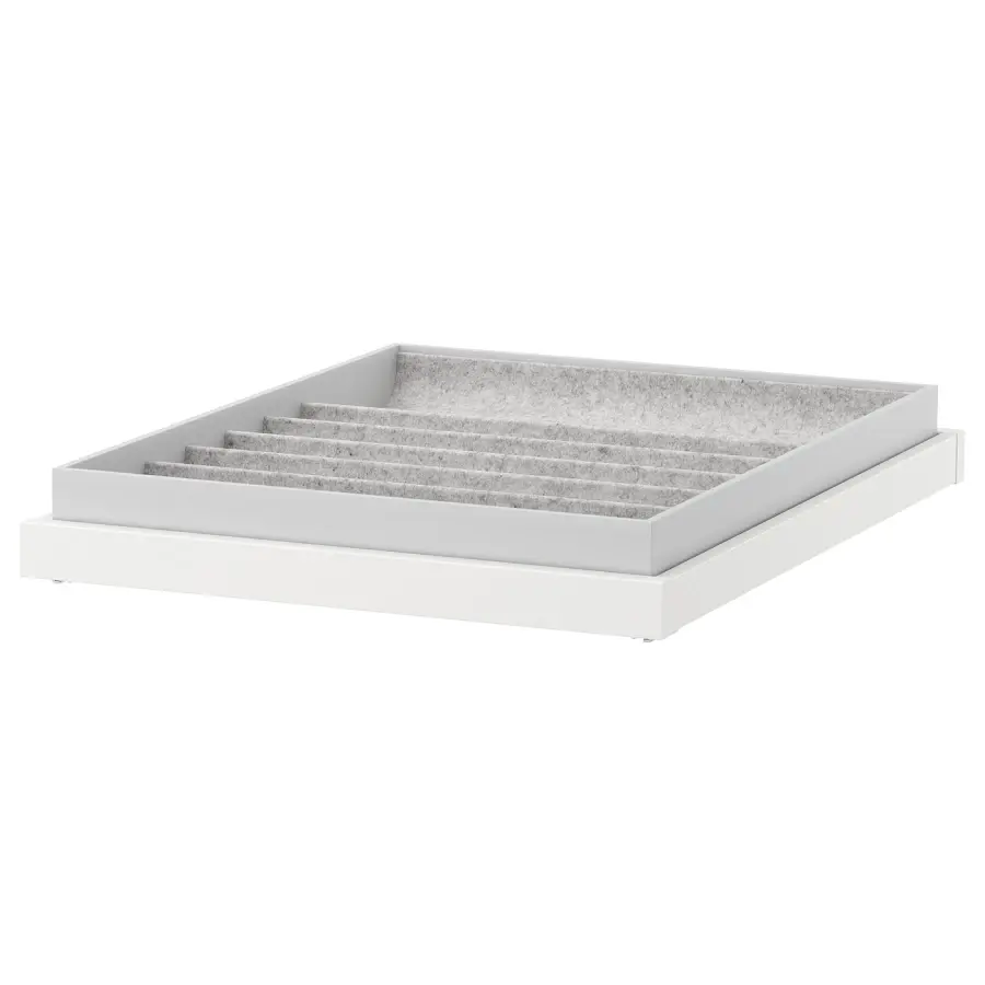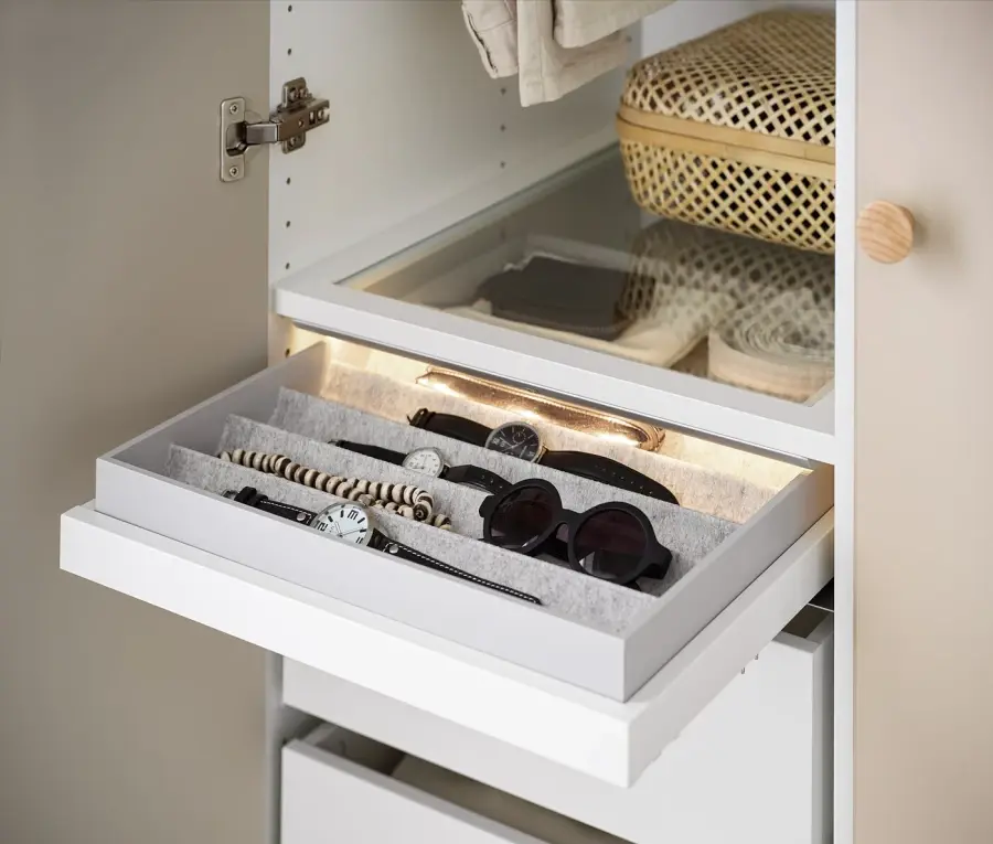 ИКЕА IKEA Вставка поможет вам хранить и упорядочивать солнцезащитные очки, часы и другие аксессуары. У каждого аксессуара есть собственное отделение с отделениями разных размеров. И все они легко доступны, когда вы размещаете вставку так, чтобы большие отделения были обращены к спине. Мягкий войлок защищает ваши аксессуары и удерживает их на месте. Вы можете легко видеть свои вещи и дотягиваться до них, когда лоток выдвигается. Медленно, бесшумно и мягко выдвигается назад благодаря встроенному демпферу. Оригинальная икея/ikea