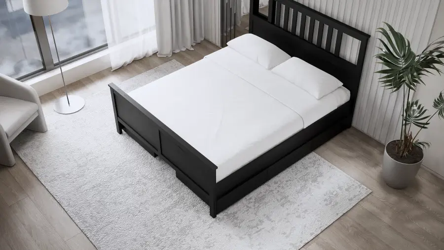 Ящик для кроватей КЫМОР изготовлен из массива сосны, пропитан морилкой и покрыт прозрачным лаком на водной основе, что подчеркивает естественную красоту дерева и обеспечивает долговечность.