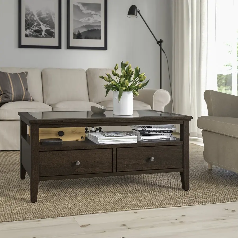 ИКЕА IKEA Стеклянную столешницу легко содержать в чистоте, она добавляет легкости вашему пространству. Под столешницей имеется открытая витрина, которую вы можете оформить собственными украшениями. Два закрытых ящика помогают поддерживать порядок. Создайте гармоничную атмосферу дома, объединив этот журнальный столик с другой мебелью серии ИДАНЭС. Инновационная складная конструкция позволяет быстро и легко собрать ящики. Ящики закрываются бесшумно и мягко благодаря встроенной функции плавного закрывания. Оригинальная икея/ikea